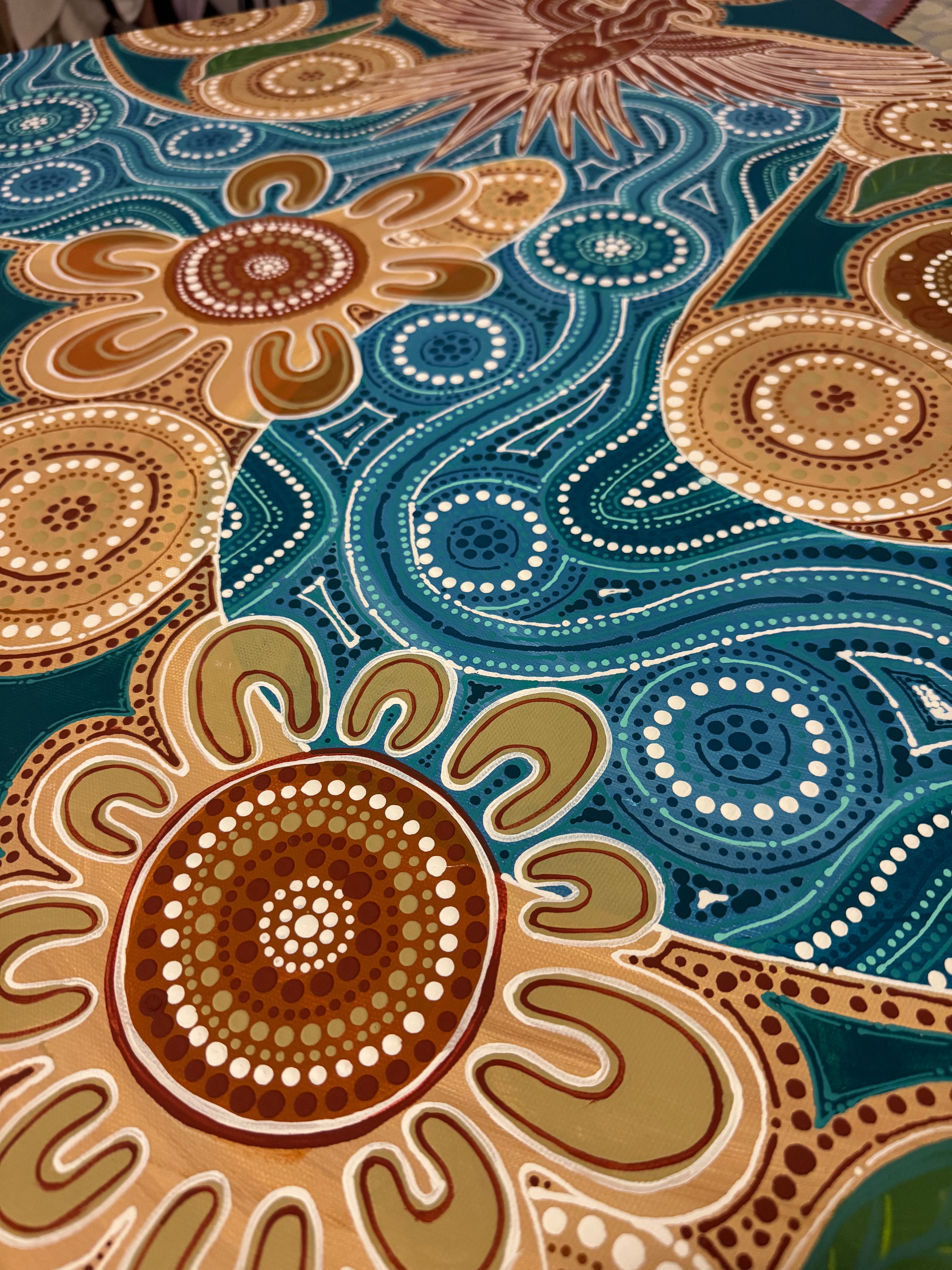 I began painting and telling my stories of what I've learnt about my culture and where I grew up through my artwork since 2017. My love for art wasn't only because of the strong passion for my Aboriginal culture, but also I've dealt with my own depression and art has given me healing and coping mechanisms to express myself. It makes me so happy to be able to teach people about our culture and keeping it strong and alive.