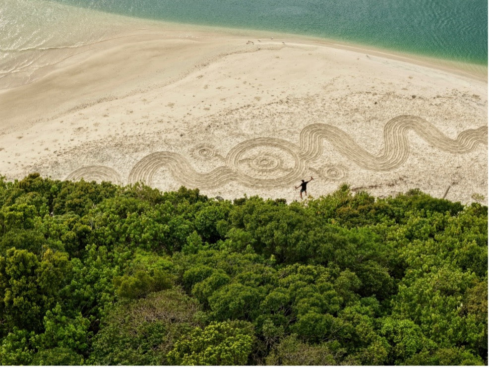 Though the artwork exists only briefly before returning to the land, capturing it from above through drone photography preserves its scale, its patterns, and its story. It becomes a moment frozen in time, a visual echo of connection, culture, and the journeys we carry within us. In this work, I honour the past, embrace the present, and look forward with hope fusing two worlds into one journey.